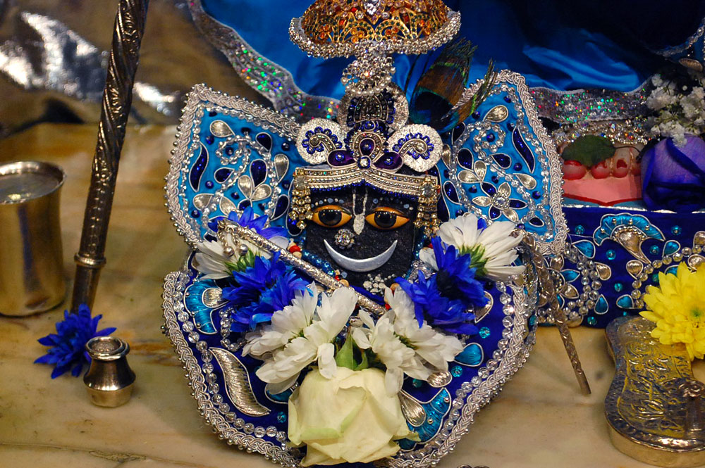 "Sometimes when I dress Radha Syama I think how nice it would be if all the devotees who are serving Them outside the deity room, could all be inside serving there. Today we will do just that by worshiping Radha-Syama with offerings of flowers, which are books distributed and laksmi collected. We will all be together in Vraja doing personal service to Them. Devotees should first call Radha Syama into their heart to accept the special seat that they have prepared today, a seat made of the jewels of their marathon endeavour to date. They should then place many sweets, savouries and drinks before the Divine Couple which are prepared on fire of sankirtana devotees’ austerities, and which will be Their Lordships’ snacks for today’s excursion. Devotees should then take as their paraphernalia for worship a variety of books, and take the pujari’s vow which is to offer all the items of worship, namely the books in their book bag. Please note that one cannot neglect to offer items to the Lord, meaning all books must be distributed, devotees cannot bring any back. After arriving at their sankirtana spot devotees may offer panamas to the parampara and begin their puja. The puja will be to bathe, dress and ornament Radha Syama with flowers. Bathing takes place in the first part of the day, dressing the second and ornamentation in the third. Flowers are both the books distributed, and the donations received, the size of both indicating the increasingly exotic nature of the flowers offered. For example a Gita may be considered a garland of jasmine flowers. When a book is sold devotees may offer their flowers in the way they prefer saying idam puspam srim-klim-radha-syamabhyam